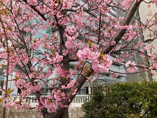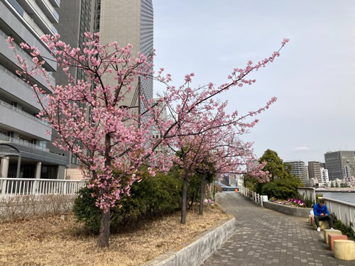 佃中央大橋の袂で早くも気の早い桜が開花。