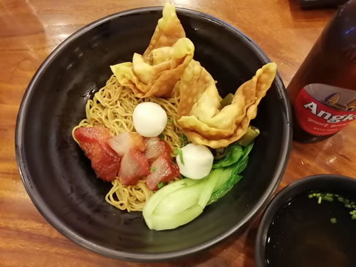 イオン・プノンペン、アジアンキッチンの揚げワンタン麺。 カンボジアのビールに合う。