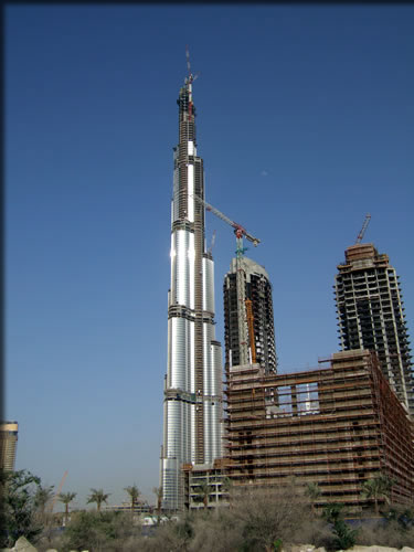 今まで世界一だった台北101(510M)をとっくに追い抜いていますが、今も4日でワンフロアーぐらいのペースで上がっていっているそうなので、もう700Mは超えているでしょう。 台北から高雄に飛行機で行くと、時々ちょうど台北101の上空でUターンして高雄に方向を変えることがあり、窓から下を眺めると台北101のてっぺんがすぐ下にあるように見えて「本当に高いな。こいつ」とその高さに感心したものでしたが・・・さらに200Mも高くなっているのですねぇ。 最終の高さは当初700Mと発表され、その後「800M以上」と修正され、さらには「最終の高さは秘密」ということになっているそうです。 一説では950M(189階)までいくとか言われていますが、他にさらに高いビルが計画されたときに、また延長してとにかく世界一の座を獲得するため秘密にしているそうです。 しかし、最近サウジアラビアで1,600Mという1マイルビルの計画が発表されたようですが、さてドバイはどうでるのか。 楽しみでもありますが、この中東の沸騰状態、いつまで続くことやら・・・・ (ドバイ編~その3に続く)⇒ (2006.9.14) |