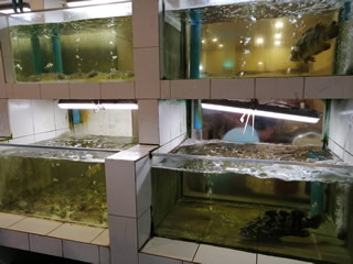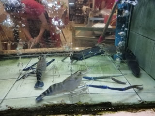 生け簀にハタやシャコ、海老が元気に泳いでた。