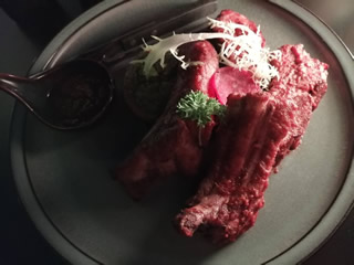 ボリュームたっぷりのスペアリブをビールとワインで。 フライドポテトと焼トマト付き。