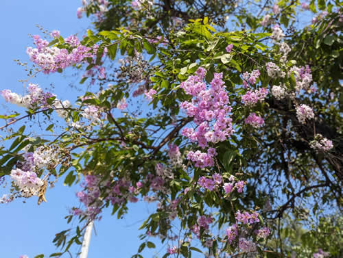 太太とこの花を見て、ケニアで愛でていた「ジャカランダ」(アフリカの桜とも呼ばれる)みたいと話していましたが、調べたところ「オオバナサルスベリ」だそうです。↓ 葉から糖尿に効くお茶ができるとか。