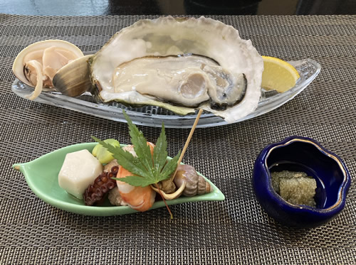 9日、太太、妹、義姉と福島市南光台の南風亭へ。 先付け、カキとアサリ、子持昆布。