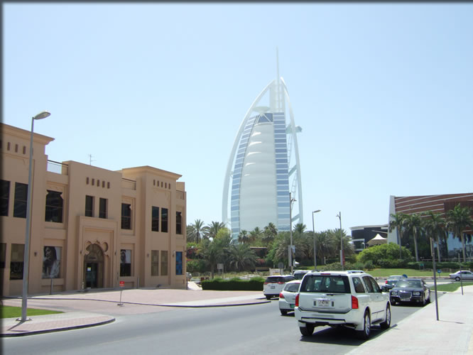 そびえ立つブルジュ・アル・アラブ。手前の茶色のビルは取引銀行(Emirates Bank)。