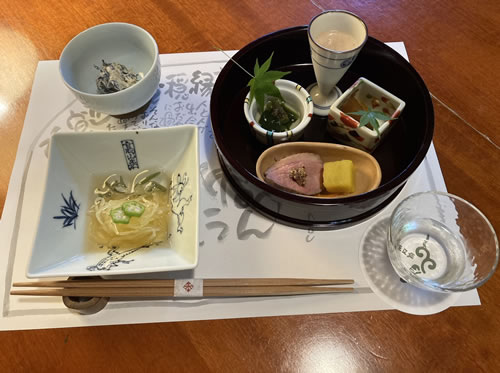箸付(南京素麵、順才、白和合)と前菜(白桃すりながし、つる紫、とんぶり等)