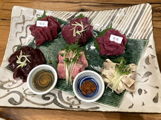 馬刺盛合せと〆のしょうゆラーメン。