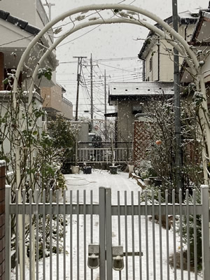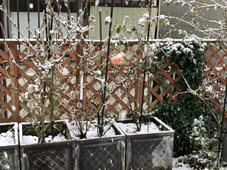 我が家の庭も雪が積もって、一凛だけ残っていたバラも寒そう。