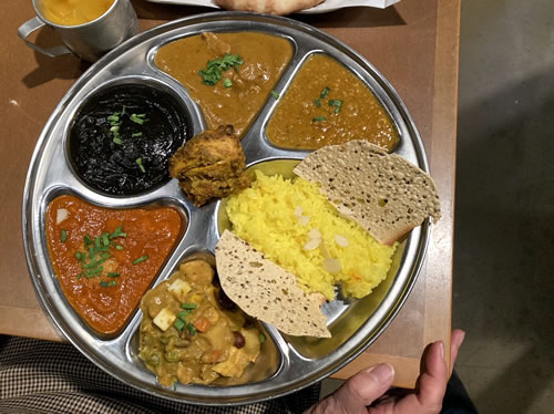 5種のカレー(バターチキン、キーマ、シーフード、野菜、漆黒)セット。