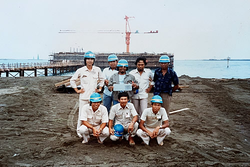 初めての海外赴任でスマトラ島の奥地、アルンのLNGプラント内の海水取水口建設工事に従事。 所長以下、当社の施工部隊と記念写真。