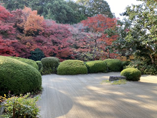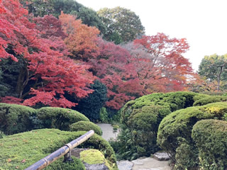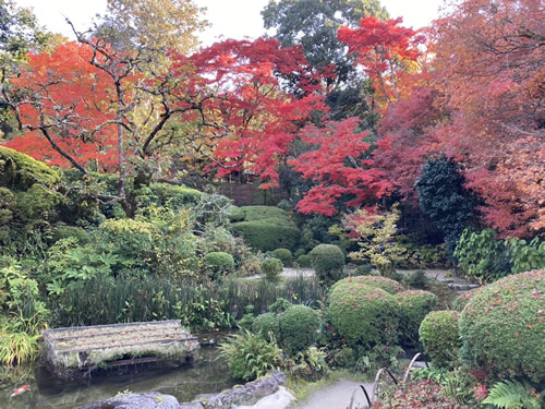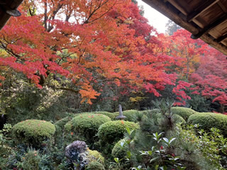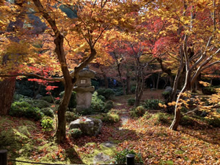 赤く色づいた葉が庭園に落葉して絨毯のように見える敷き紅葉と、座敷の中から軒先の柱や窓枠を額縁に見立てて眺める額縁紅葉が有名になり、紅葉の季節の拝観は日時と時間指定の予約が必要。