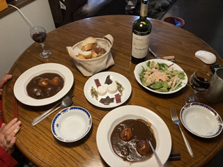 (現在/ふたりきりのクリスマス) 今年のクリスマスイブはどこにも出かけず、家でたいたいと二人ビーフシチューでワイン。