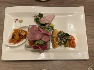 前菜、生ハム&チーズ、大海老のパスタ、新じゃがのピッツァ、モンブラン&ジェラート等々。