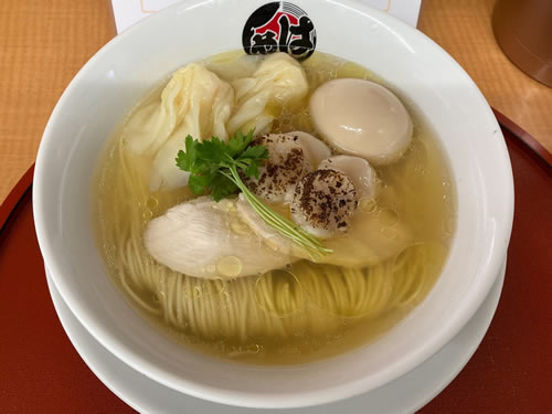 明るいうちは治安も良好で、ペット連れの乗客も。 今回のラーメンは、切除したポリープの検査結果(良性)を聞いた後に食べた「らーめんはやし」の帆立らーめん 味玉、海老ワンタン2ケトッピングして2150