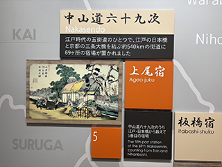 モールの壁に中山道六十九次の掲示があり、普段は見過ごしていたのをじっくり見てみると・・・ 「江戸時代の五街道のひとつで江戸の日本橋と京都の三条大橋を結ぶ約540kmの街道に69ヶ所の宿場があり、上尾宿は日本橋から数えて5番目の宿場。 日本橋から出て最初に泊まる宿場として、小さな宿場にもかかわらず、本陣1軒、脇本陣3軒、旅籠41軒と旅籠が多かった。 しかし、安政7年(1860年)の大火で宿場の遺構は残ってない」 けっこう昔は栄えていたのかな・・・