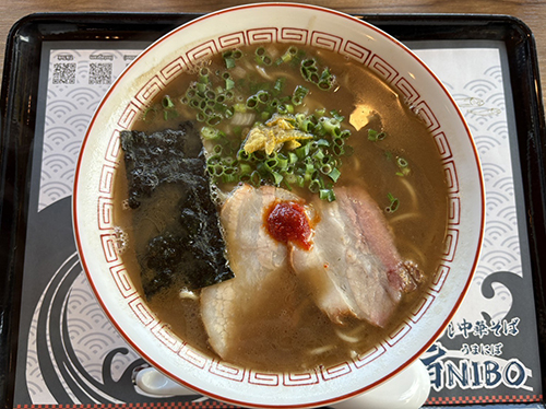今週のらーめんは花月の期間限定『煮干し中華そば 旨NIBO』。 「過去に手がけたオリジナル煮干しラーメンや、有名店とのコラボ経験で培ったノウハウをもとに、花月嵐がゼロから組み立てた、新しいかたちの煮干しラーメン」だとか。