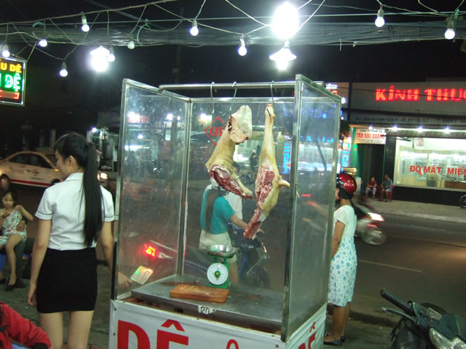 店頭のケースにヤギが1頭吊るされていて、ここから肉を取って料理する。だんだん小さくなっていくのを眺めながら食事。