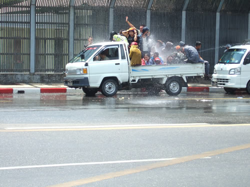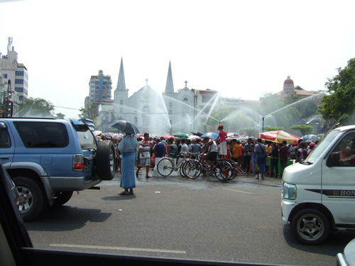 13日から16日までは会社の車も使えなかったので、ほとんどアパートでじっとしていたのですが、4月15日だけは濡れてもいいと覚悟を決め、祝日中も開いている奇特な和食レストランまで4キロほどの道を太太と二人歩いていきました。 ブロック塀の隙間からホースで狙い撃ちされたり、洗面器に入れた氷水をかけられたりと、途中何度も水をぶっかけられました。 1年の穢れを落とし、身を清めるために水を掛け合うそうですが、若者など喜々としてシャワーのように水を浴びながら踊っていたりと、ストレス解消のようになっているようです。 今は乾季の終わりの時期で毎日最高気温が40度にもなるので、ずぶ濡れになっても風邪をひくようなことはないのですが、汚れた水を使うこともあるようで、体調を崩す人もけっこういるようです。