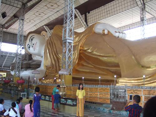 仏塔の高さはシュエダゴン・パゴダより高く、ミャンマー最大とか。 写真のフレームに入りきらず…。 最後は、バゴーの象徴と言われるシュエターリャウン寝仏。