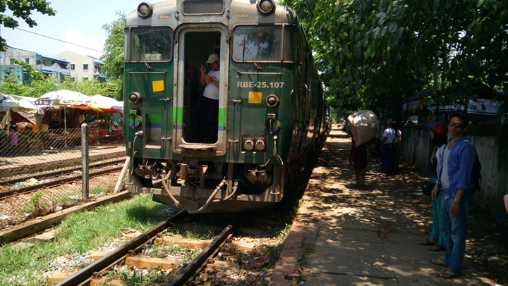 これは日本の車両。正面開放部の左右上部には、赤文字の日本語で「架線注意」と書かれている…よく見えないが。