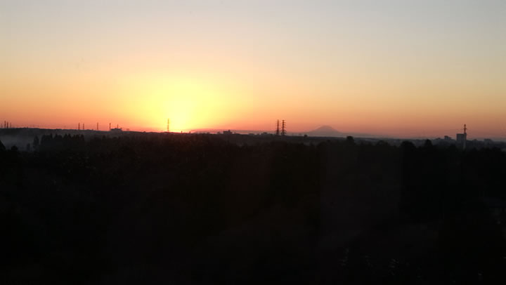平成28年の大晦日の落日。成田ビューホテルの部屋から撮影。遠く富士山が見える。