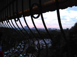 ビルの上空から。 川沿いの公園と市街。