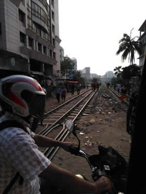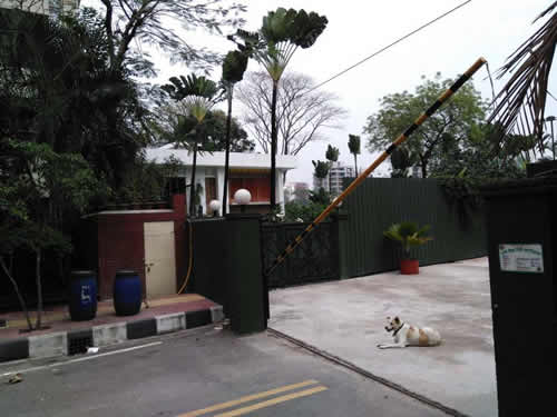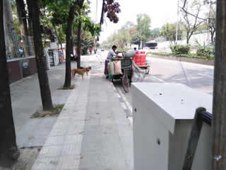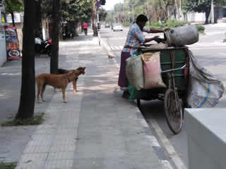 | ◆ 街中の点描 市街地は飼い犬、野良犬もそこら中にいるし、ごみもあふれてるし、電車の線路の上まで人が歩いてる。 いつも渋滞して通勤が大変。 ということで、ゲートを守る犬(笑)↓