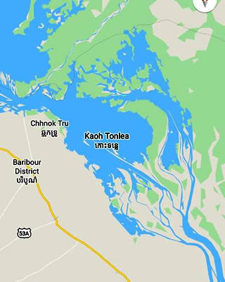 ずいぶんと大きさに幅がありますが、水深も1年のうちほとんどの期間は水深1mくらいの深さなのに、雨季になってモンスーンが吹くといつもは湖からメコン川に流れ込んでいるトレンサップ川が逆流して湖の面積が広がり、深いところでは10mにもなるとか。 肥沃なメコン川の流れと普段は森である場所まで湖が広がることによって湖に栄養が豊富に供給されてプランクトンや魚が大量発生。 体重100KGを越えるメコンオオナマズ、フグ等600種以上の淡水魚が生息しワニも生息しています。 水上生活者の数も100万人ほどいて世界最大規模。 ただ湖上に住む人の多くが無国籍者。貧しいカンボジア人の他に戦争から逃れてきたベトナム人が暮らしているのだそうです。 実際の写真は以下のとおり。 Mapの中央左が水上生活者らがいるChhnok Tru。
