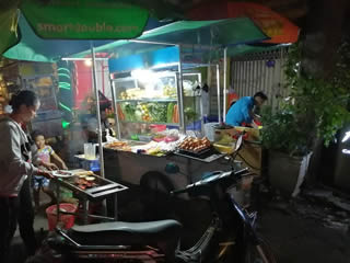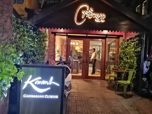カンボジアは1世紀ごろに扶南として国を興した東南アジア最初の国で、カンボジアの食文化が周辺各国へ影響を与え、多様な文化が行き来して様々な味や手法が混ざり合ってカンボジア独自のスタイルを築き上げたとか。 トンレサップ湖の魚(雷魚やナマズ、エビ、カニや亀など多彩)を使った料理が多く、割とあっさりしていて日本人の舌にも合うのではないかと感じました。 ということで、いつものように写真に沿って説明を。 まずは先ほどのクメール宮廷料理の名店「Kravanh」 の周辺の様子。 店の周辺は屋台がいっぱい。