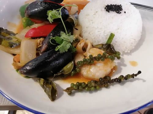 さて、「クメール風シーフード生胡椒炒め」。 世界一おいしいというカンボジアの生胡椒を使った炒め物。 イーオン内のカフェのメニュー。