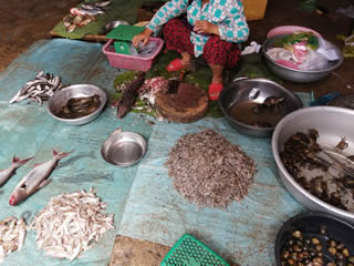 そして、コンポンチュナン市場の魚。 左端の大きいのが雷魚 まな板の右にいるのは大ナマズ。