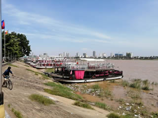 ボートレースが開催されていればトンレサップ川沿いのホテル・カンボジアーナの部屋を取って、部屋からボートレースや花火を眺めることができたのにと思うと残念です。 ということで、後は写真に沿って説明を。 水祭り前日のトンレサップ川。雨季なのに水量かなり少な目。