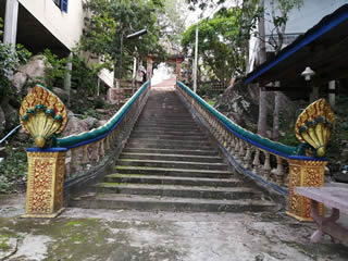 本堂への階段。ナーガが両側の手すりでにらみを利かす。