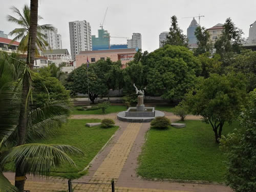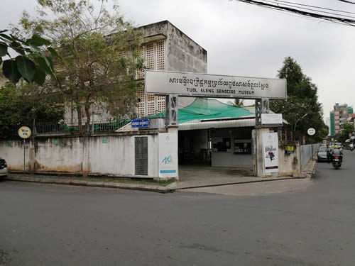 博物館はもとは高校の校舎だった建物ですが、中に入ると犠牲者の頭蓋骨や、収容者の写真、拷問に使われた道具などが並んでいて、建物の中は撮影禁止でしたがそもそもシャッターを押すような気にはなりませんでした。 その日は入館者が他に誰もおらず、空調も全くなかったため空気がやたらと重たく感じられ憂鬱で悲しい気分になってしまいました。 ということで、写真を撮れた風景のみ順に説明します。 最初はトゥールスレン虐殺博物館入口。もとは高校の校舎だったと言う。