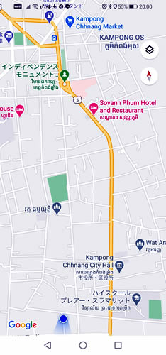 ぼくが一年ぶりに日本に帰る日が緊急事態解除の日という劇的展開はなくなったようです。 こちらカンボジアでは、1月29日現在で累計感染者数、463名(治癒者438名)死者はいまだゼロのままです。 このままこちらに残った方がよさそうな気もしてきますが、先日「カンボジアで継続して勤務できないか。できれば長期で」との打診があり、すっかり帰る気になっていたところ寝耳に水の話でしたが、速攻でムリ、と返事。 もう老い先短いのだからこれからは愛する家族と一緒に暮らしていきたいと思います。 24日の日曜日はコンポンチュナン最後(たぶん)の散策をしてきました。 宿舎から現場事務所前を通ってニアンコングレイ像を横目に見て独立記念塔からCity Gardenを抜けて野生の猿が住み着いている州事務所ホールを回って市場迄行くコースです。 ということで、後は写真に沿って説明を。 Google Map 青印が宿舎。北に一キロほどにある緑が寺院。