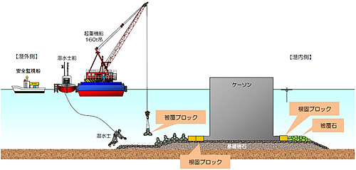 ケーソンを沈めて設置する場所は、潜水士が潜ってあらかじめ投入された捨て石を人力で敷き詰めて平らにするというけっこう原始的な方法でやっていて驚かされたものでした。