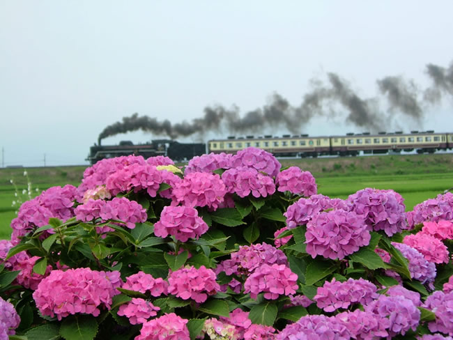 葉羽【※2016.8.4】 再び紫陽花。ところが、7月5日(#020)の投稿と比べてみると、こちらの方が枯れていません。不思議です。それともう一つ。現時点で最新投稿の2016.7.17「ばんえつ物語号」と10年前のこの写真はアングルが同じです。同じように咲き続けているのですね。