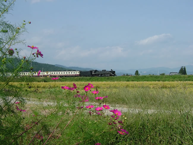 葉羽 磐越物語号とコスモスのコラボ作品です。コスモスの淡い紅色は日本情緒そのものですね。