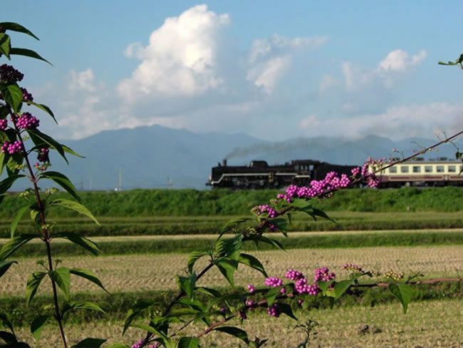 しばらくぶりに「写真」を撮影しました。秋空にムラサキシキブとばんえつ物語号です。