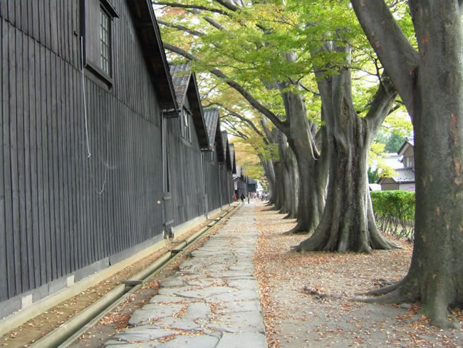 小粋な黒塀の倉庫沿いに石畳の散歩道がありますね。