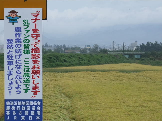 ちょうど稲刈りの頃に気候も良くなって、SLファンの皆様が大挙して来るものですから、止むを得ずこんな看板を。