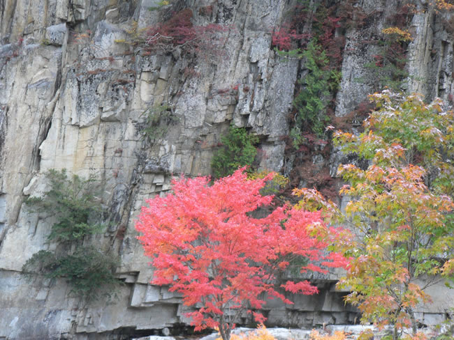 葉羽 屏風岩は、南会津町大桃の字平沢山地内にあります。伊那川の急流が、長い年月の間に硬い岩肌をこんなふうに削ったんですね。ちょうど今時分は、紅葉した山モミジが綺麗な頃です。