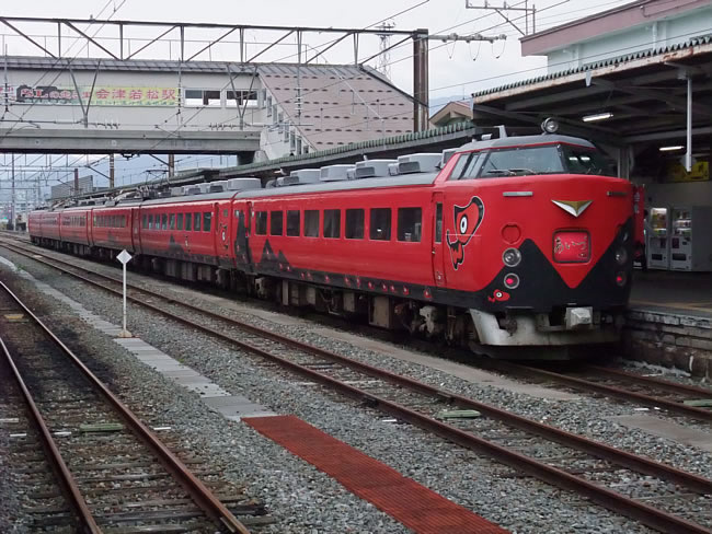 なっちヤン【2011.2.9up】 昨年秋の写真ですが、観光キャンペーン列車・特急あいづ、通称「あかべぇ号」です。車体に赤ベコが描いてあります。