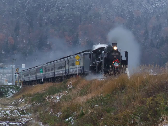 葉羽 クリスマス・シーズンの土曜・休日を中心に「SL X'masトレイン」として運行されます。なお、ばんえつ号の正式名称は、2008年からヘッドマークに準じた「SLばんえつ物語」に変更。略して「バンモノ」とも呼ばれるそうです。