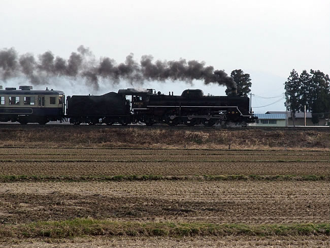 葉羽 しばらくぶりの「ばんえつ物語号」。いつもと違う角度で撮影されています。列車に隠れてなっちヤンの家があります。