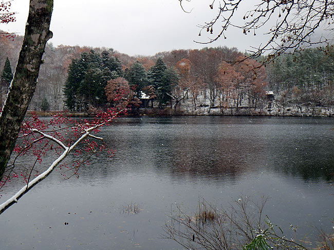 葉羽 観音沼は、会津下郷町の観音沼森林公園の中にあります。周辺には遊歩道がめぐらされ四季折々の美しさを楽しめる花木が植林されています。この観音沼のところどころには浮島があり、とても神秘的な雰囲気。粉雪がチラホラともなれば、なおさらですね!