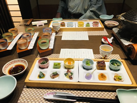 写真は、Storyスナップ「那須周遊/渓流露天風呂の旅」第7集より大丸温泉旅館の夕食で最初に供された「先付け」えええ~コレだけでお腹いっぱい!