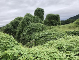 写真は、いつものコラボから伸一が散策中に出合ったグリーンモンスター。締め付け植物のクズが育ってしまうと、このように宿主を覆って枯らしてしまう、まさにモンスター。