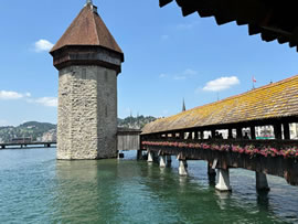 写真は、ミルクティーの「スイス旅行記」第8集よりルツェルンのロイス川にかかるカペル橋。屋根付きの珍しい橋ですが、実は過去の城塞の一部。