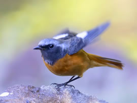 写真は、瞬間の魔術師T.sakumaの野鳥ギャラリーより、ジョウビタキのオスが飛び立とうとする後間。背景の黄やパープルの植生の色も美しい♪