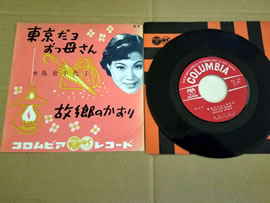 写真は、謎のおじさんアンブレラあつしの「風に吹かれて」より、島倉千代子のヒット曲「東京だョおっ母さん」のレコード画像。えーと、どんな歌だったっけ?(笑)